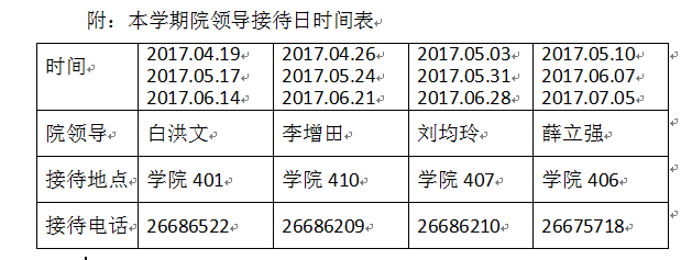 一、周三下午2:00—5:00为院领导接待日,确定一名院领导负责接待师生的来电来访工作并做好接待记录。