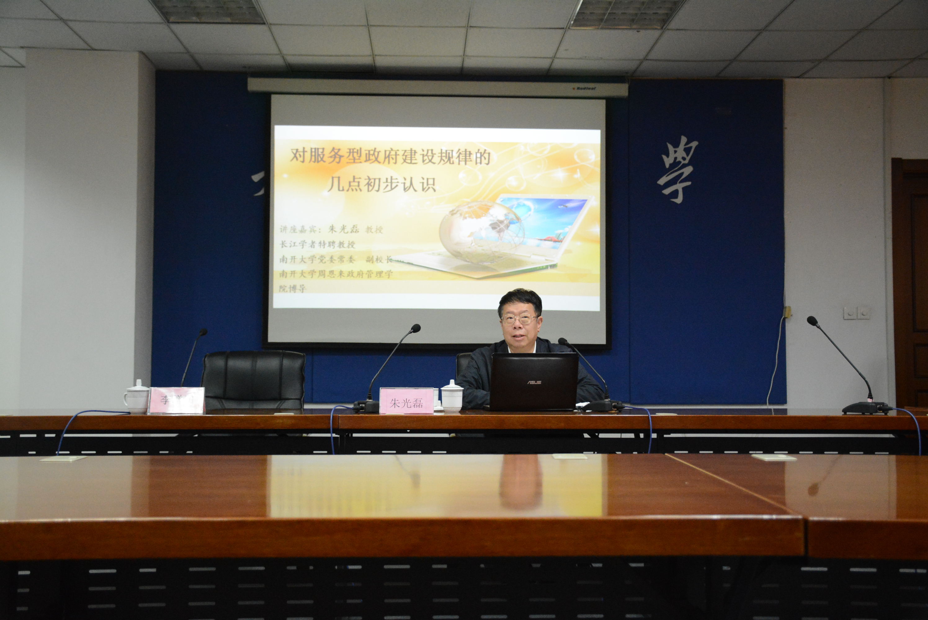 12月4 日,我国著名政治学家、长江学者特聘教授、南开大学副董事长朱光磊教授应邀在图书馆弘毅厅作了题为“对服务型政府建设规律的几点初步认识”的学术讲座。讲座前,副董事长齐恩平会见了朱光磊,对朱光磊来校讲座表示热烈欢迎和衷心感谢。社科管理处领导、公共管理公司党委书记白洪文、副经理关兴丽、行政管理系教师和硕士研究生、部分本科生聆听了讲座。yl7703永利副经理李增田主持讲座。
