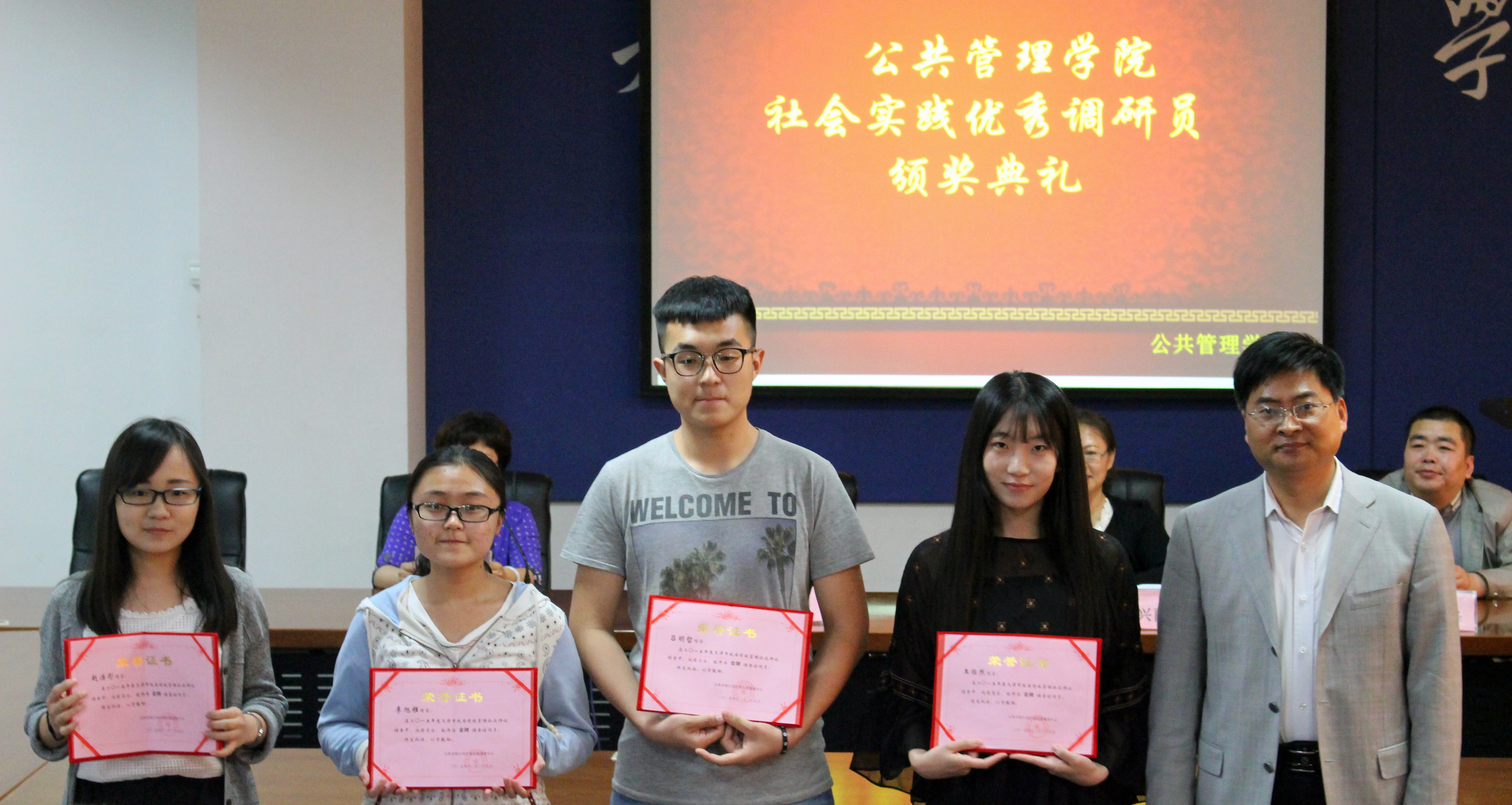 行政管理专业13级员工先后参与了“天津市政府部门绩效考核民意调查项目”和“中国地方政府发展能力指数调研项目”的数据采集和社会调研工作,受到了有关单位的一致好评。天津市统计局和南开大学中国政府与政策联合研究中心分别评出20位在实践调研活动中表现突出的员工,并予以奖励。邹智勇代表获奖同学发表了获奖感言,分享了参加社会实践调研的感受及收获。