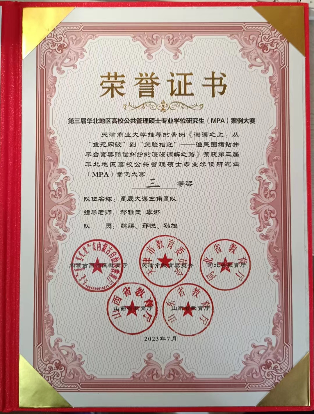 7月29日,第三届华北地区高校公共管理硕士专业学位研究生(MPA)案例大赛决赛在呼和浩特市举行,由公司yl7703永利郝雅立老师、李娜老师指导的,公共管理2022级学术型硕士魏腾,专业型硕士邢悦、孙旭三位同学组织的团队案例《渤海之上:从“鱼死网破”到“笑脸相迎”——渔民围堵钻井平台索要赔偿纠纷的漫漫调解之路》荣获大赛三等奖。